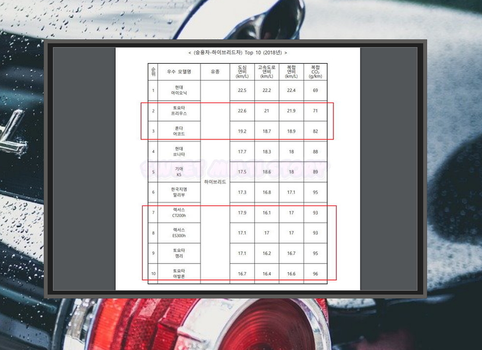 일반 하이브리드의 경우 수입차 못지 않게 연비좋은 국산차가 많아요. 아이오닉, 쏘나타, K5, 말리부, 니로 등인데요. 수입차의 경우에는 일본 기업에서 만드는 프리우스와 어코드가 높은 순위를 차지하고 있어요. 프리우스의 경우에는 1리터 당 평균 20킬로 이상 갈 수 있고, 내구성도 좋아 많은 분들이 선호하는 모델이에요.