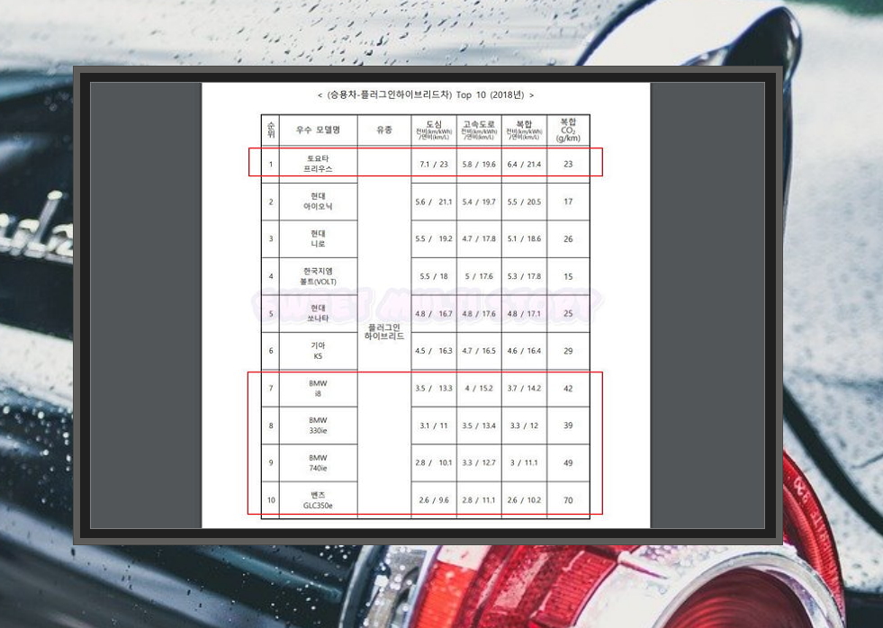 보통 하이브리드는 전기와 휘발유를 이용하는 것을 말하는데요. 플러그인 하이브리드에 대해서는 생소하게 여기는 분이 계실 거에요. 간단하게 말해서 전기 충전이 가능한 하이브리드 차량을 말해요. 일반 전기차에 비해 충전할 수 있는 용량이 적은 대신에 휘발유를 넣을 수 있죠. 플러그인 하이브리드 수입차 중에서 토요타의 프리우스가 1위를 차지하고 있네요.