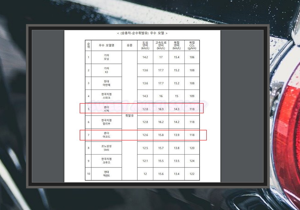 순수 위발유 중심으로는 연비좋은 수입차는 혼다의 시빅과 어코드가 있네요. 국내 경차 수준의 효율을 보여주고 있어요.