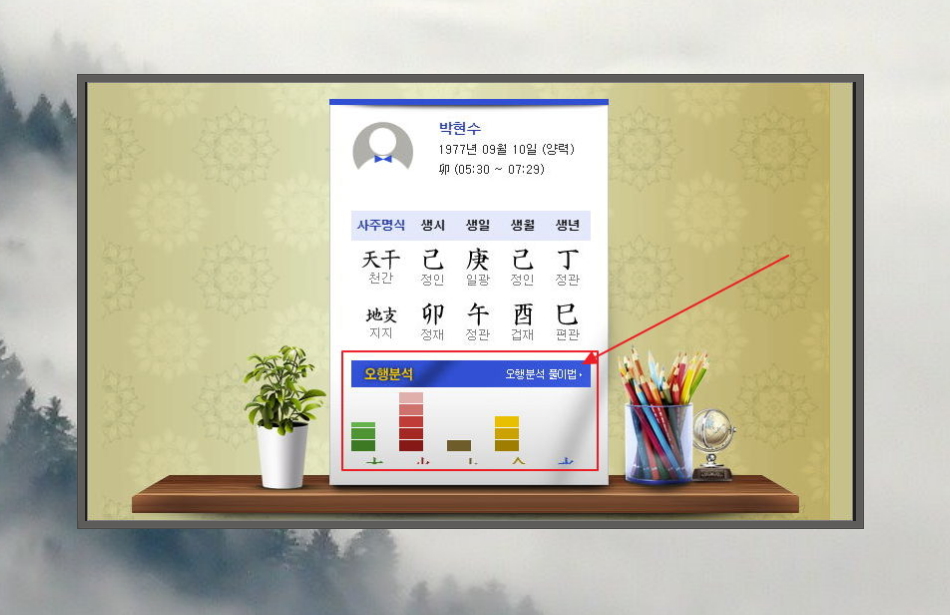 4. 이제부터 결과를 볼게요. 가장 먼저 볼 수 있는 것은 사주명식이에요. 사주 전문가가 아니라면 보기 어려운 부분이니까 넘어가고요. 바로 아래에 있는 오행분석을 우리도 볼 수 있어요. 화가 많고, 수가 없네요. 풀이법을 통해 좀 더 자세하게 풀이하실 수 있어요.