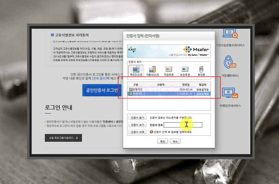 7. 여기에 사용되는 공인인증서는 인터넷 뱅킹용 인증서를 사용해도 돼요. 제가 직접 사용해 보았어요.