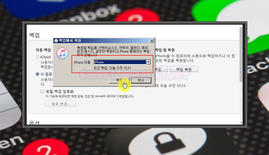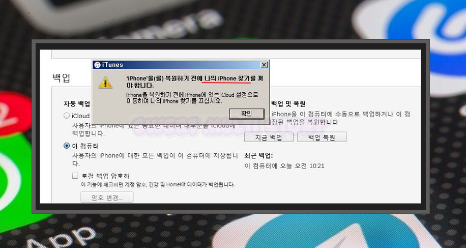 14. 찾기 기능을 끈 상태에서 아이폰 백업 복원 버튼을 다시 눌러보세요. 그럼 제대로 진행할 수 있어요.