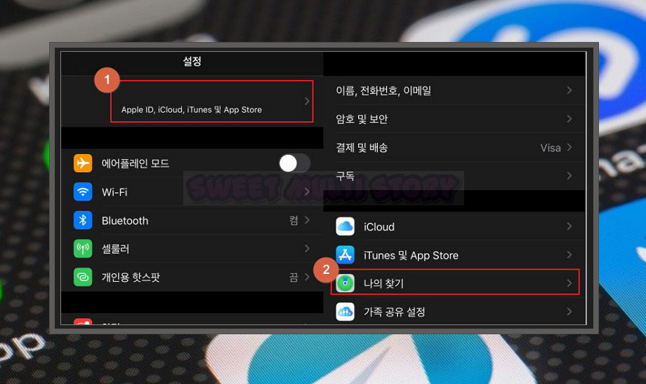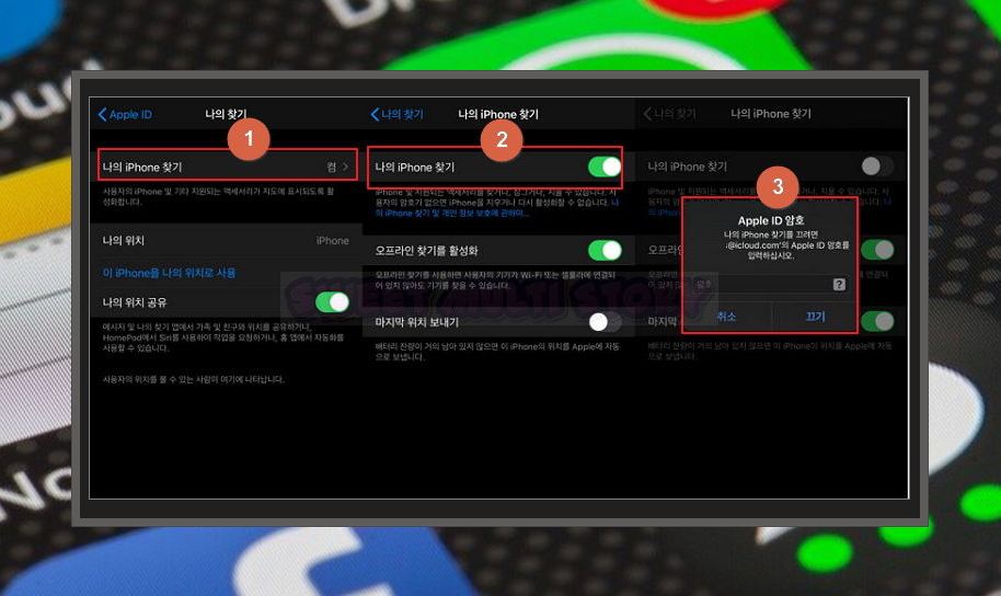 13. 제가 매긴 번호에 따라 터치를 해주면 찾기 기능을 끌 수 있어요. 마지막에는 Apple ID에 대한 암호를 입력해야 해요.