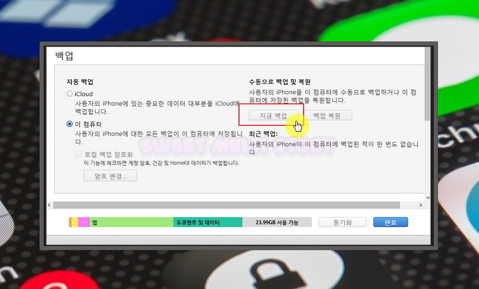 9. [지금 백업] 버튼을 눌렀어요. 'iPhone 백업 중' 문구가 나와요. 저는 5분 정도 걸렸던 것 같아요.