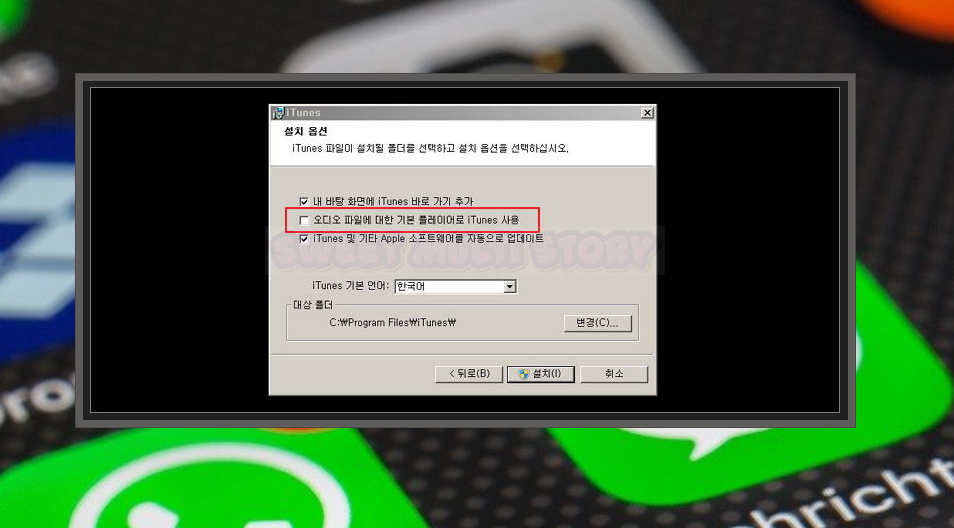 3. iTunes 설치 방법은 간단해요. 안내에 따라 다음 또는 설치 버튼을 눌러주면 돼요. 음악 플레이어를 따로 사용하는 것이 있다면 '오디오 파일에 대한 기본 플레이어로 iTunes 사용'에 체크를 해제해 주세요.