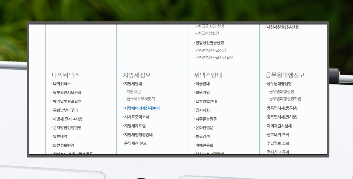 3. 제가 말한 버튼을 누르면 사이트에서 제공하는 모든 서비스에 대한 리스트가 나타나요. 지방세 정보 카테고리를 보면 "지방세 미리 계산해보기"가 있어요. 클릭해 주세요.