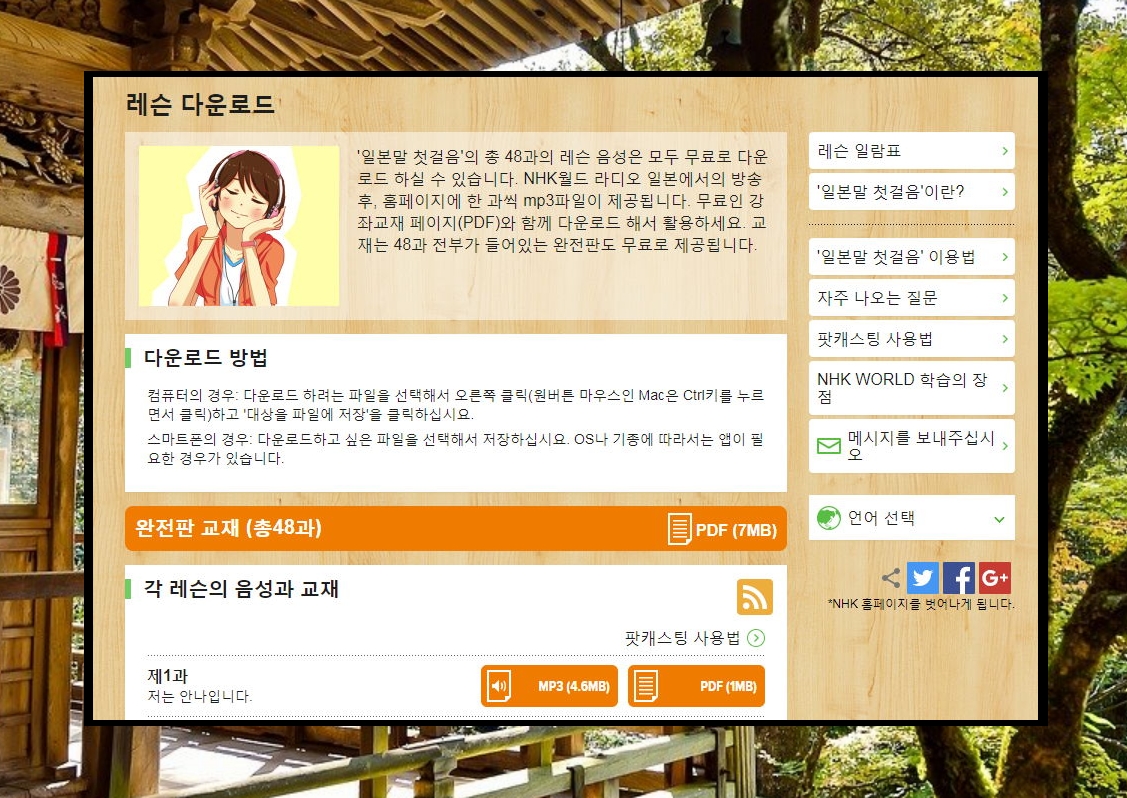 5. NHK의 일본어 첫걸음 사이트에서는 기본 일본어 학습교재를 받을 수 있습니다. 기초적인 수준이기 때문에 히라가나와 가타카나를 익히는 수준에서 배우기 좋습니다. 간단한 인사, 자기 소개, 감사 표현 등 실생활에서 유용하게 사용할 수 있는 것들이 많이 나와요.