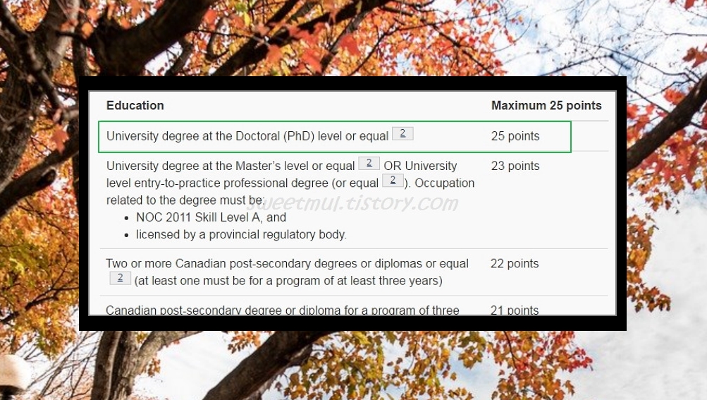 Doctoral Degree (25점), Master's Degree (23점), 2년제 이상의 학사 학위 (21점)