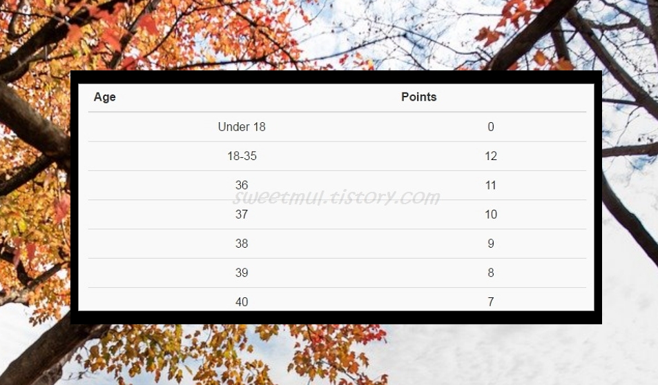 캐나다의 기술이민을 이용하신다면 18~35세 사이가 가장 유리합니다. 35세부터 한살씩 나이가 들때마다 1점씩 감점되고, 47세이상이면 0점이 된답니다.