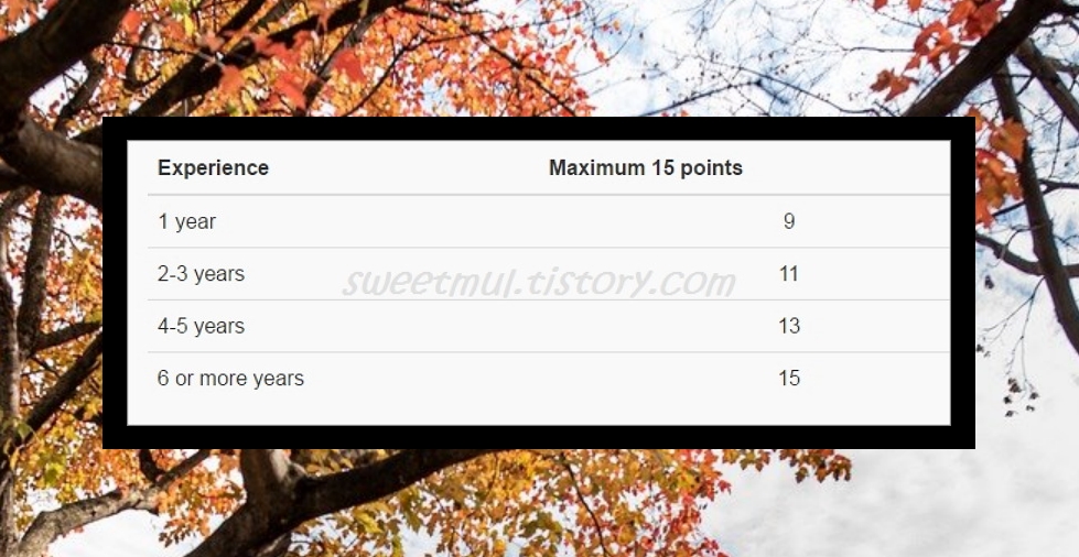 기술이민 직업군에 포함된 경력이어야지 인정받을 수 있답니다. 일주일에 최소 30시간 일을 한 직장이어되고요. 이전에는 최대 21점이었는데, 금일 사이트에 접속해서 확인해보니 15점이 최대점수네요. 기본적으로 1년 이상의 취업경력과 IELTS 6.0 이상이어야 지원이 가능하오니 참고하시길 바랍니다.