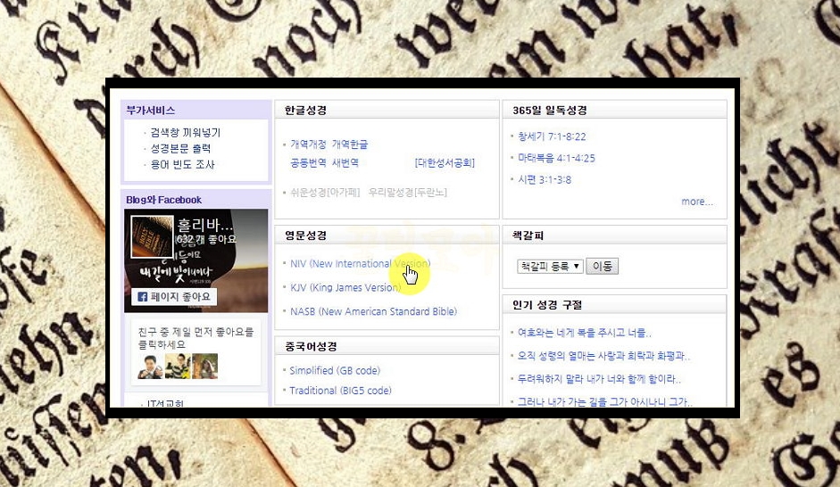 영어든 한글이든 성경을 읽기에 좋은 곳인데요. 다양한 버전의 자료를 이용할 수 있어서 정말 편리합니다.