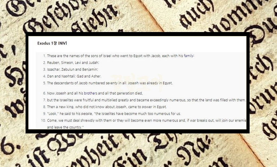 이렇게 인터넷 성경을 이용하여 Exodus 1장(niv)를 펼쳐보았습니다. 기본적으로 읽는 법은 이와 같은데요.