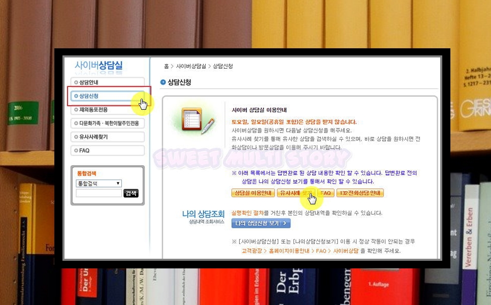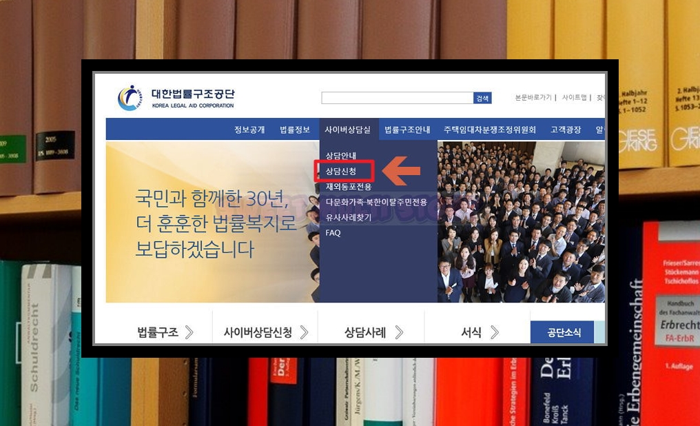 홈페이지에 접속하여 사이버 상담실 메뉴를 선택하면 신청 버튼이 나옵니다. 클릭해주세요. 기본적으로 법률 상담은 사이버, 전화, 방문을 통해서 받으실 수 있습니다. 비용이 들지 않기 때문에 정말 좋아요. 이 중에서 편하신 방법을 사용해주세요. 생각을 정리할 겸 온라인으로 작성하여 상담을 받는 것이 좋습니다.