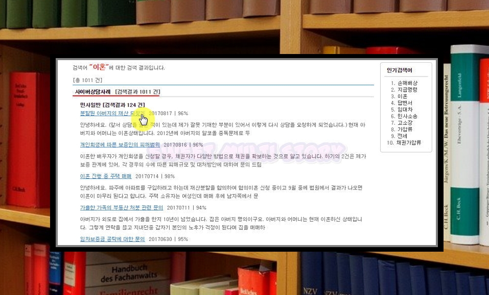 최근 1년 사이에 만들어진 자료임에도 불구하고 1011건이나 검색이 되네요. 주로 이혼이나 재산문제로 변호사에게 찾아가는 일이 많습니다. 이럴 때 비용을 지불하는 상담 서비스를 이용하기 전에 여기서 사례를 확인해보세요.