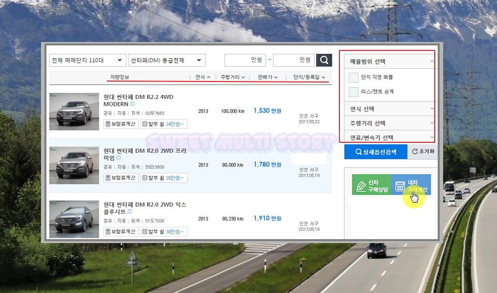 지금까지 싼타페 중고차 시세표를 알아보는 방법을 알려드렸는데요. 정보화시대인 만큼 정보가 돈이 되는 세상입니다. 직접 리스트를 보고 원하는 조건에 따라 매물을 찾아보세요. 쉽게 파악하실 수 있습니다.