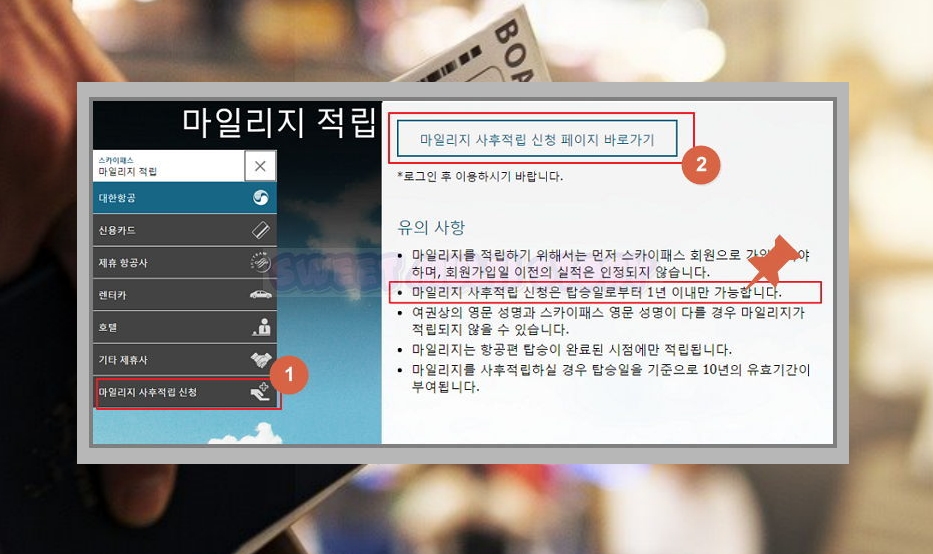 포인트를 적립하기 이전에 먼저 확인해야 할 것이 있습니다. 적용할 수 있는 항공권인지 따져보는 것인데요. 위에 표시된 '적립 불가' 항공권을 포함하여 마일리지 보너스 및 2세 미만 유아용 비행기표, 스카이패스 회원 가입일 이전의 탑승권은 적용되지 않는답니다. 미리 확인해 주세요.