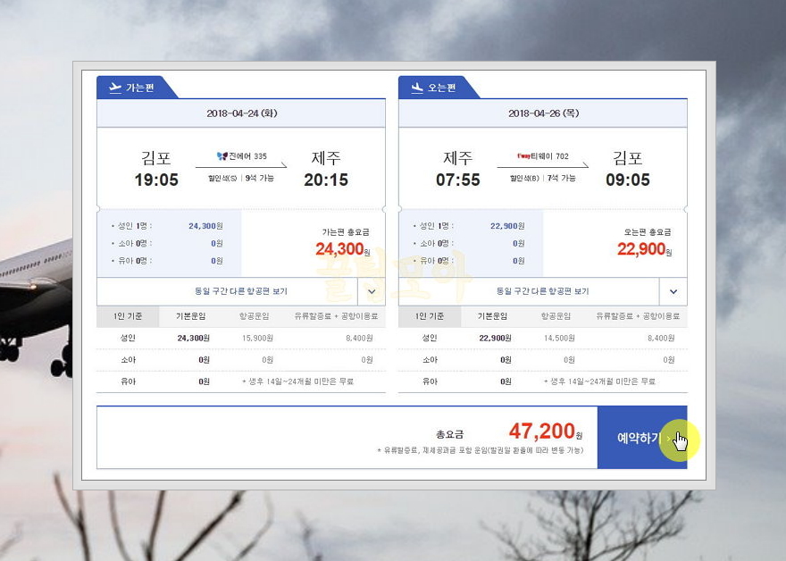 7) 마지막으로 운행 일정, 세부 운임, 유류할증료 및 공항이용료 등을 꼼꼼히 파악한 후 예약하기 버튼을 누르면 됩니다.