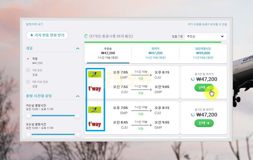 4) 이제 제주도행 항공편과 탑승 시간을 정해야 하는데요. 보시는 바와 같이 티웨이와 진에어가 나타났습니다. 가격비교를 통해 저렴한 티켓을 검색하면 저가항공뿐이 없습니다. 제주도를 가는 대형항공사의 티켓 가격은 상대적으로 높기 때문이죠. 예약을 하려면 선택을 눌러주세요.