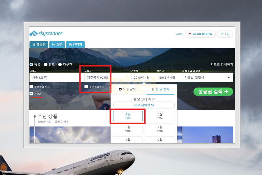 2) 처음 이용하는 분들은 사용법을 잘 모르실 수 있습니다. 일단 제주도는 가깝기 때문에 직항만을 체크해 주시고요. 도착지는 제주공항을 정해주세요. 여행 날짜의 경우에는 한 달 전체로 설정하는 것이 좋습니다. 그래야 가장 싼 티켓을 찾을 수 있어요.