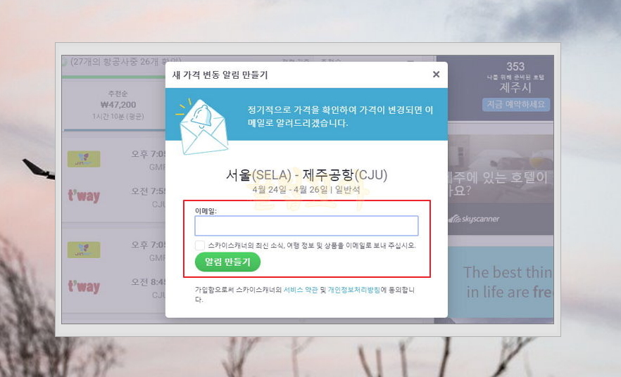5) 지금까지 진행한 제주도 저가항공 가격비교를 주기적으로 하고 싶은 경우에는 가격 변동 알림 서비스를 이용하면 됩니다. 그럼 싸게 나온 티켓에 대한 정보를 이메일로 알려줘요.