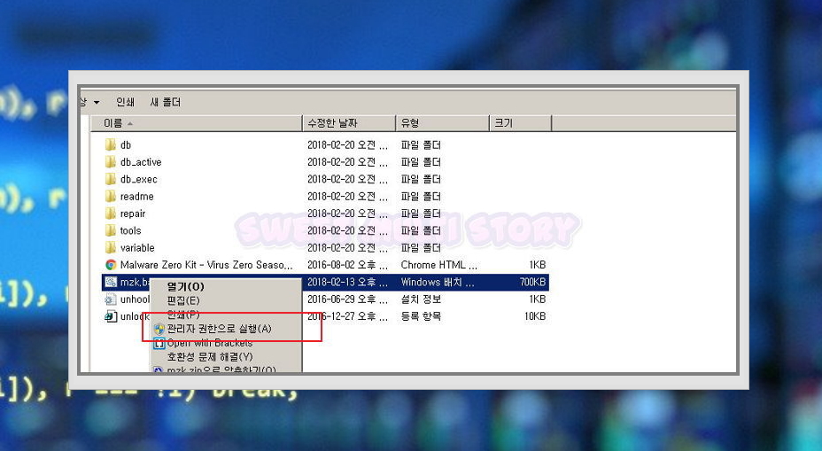 ▲ 이번에 다운로드 받은 압축 파일을 풀고, mzk 폴더로 이동하면 확장자가 bat로 되어 있는 실행 파일을 찾을 수 있습니다. 해당 파일에 마우스 오른쪽 버튼을 누른 후 "관리자 권한으로 실행"을 클릭해주세요.
