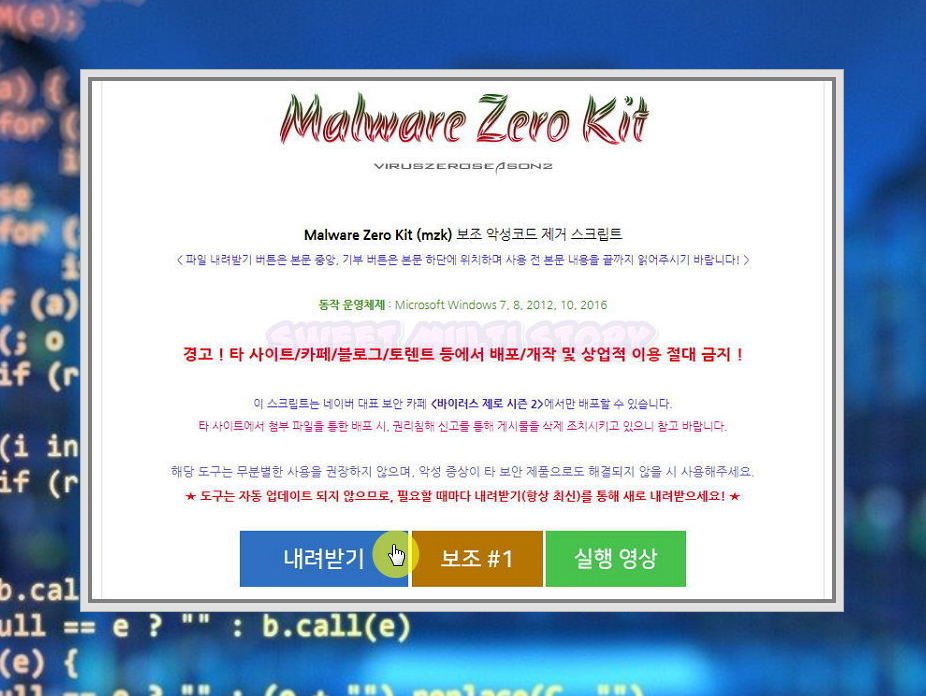 ▲ mzk의 풀 네임은 Malware Zero Kit 입니다. 보조 악성코드 제거 스크립트인데요. 해당 프로그램은 네이버 보안 카페인 바이러스 제로 시즌 2에서만 받을 수 있습니다. 해당 카페에 따로 가입을 하지 않아도 되기 때문에 부담 없이 이용하실 수 있습니다.