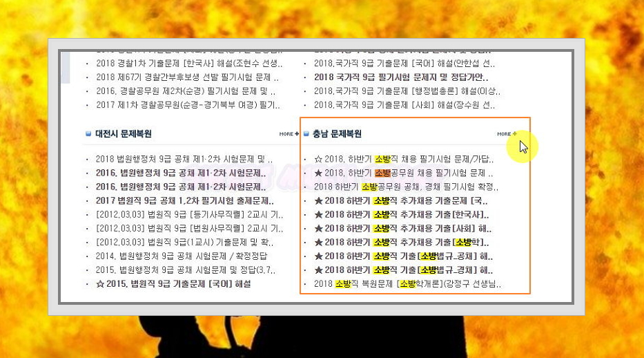 3. 화면 아래쪽에 위치한 리스트를 보면 충남 문제복원 게시판이 있어요. 여기에 소방공무원 기출문제가 많이 있네요. 한국사, 사회, 국어 등의 과목에 대한 문제를 구할 수 있어요. 옆에 있는 More 버튼을 눌러 주세요.