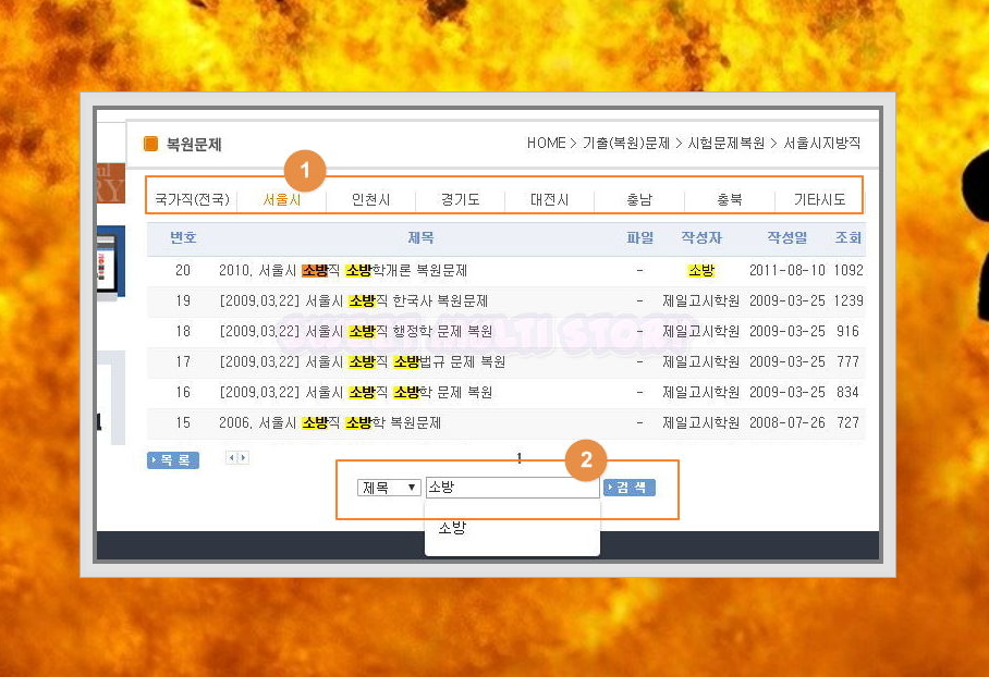 5. 카테고리에 있는 서울시, 인천시, 경기도, 대전시, 충남, 충북, 기타시도를 클릭해 주세요. 그 다음 검색창에 소방이라고 입력한 후 검색 버튼을 눌러주세요. 검색해보니 서울시 소방직 한국학, 소방학개론, 행정학, 소방법규, 소방학 등 복원 문제를 만나볼 수 있네요.