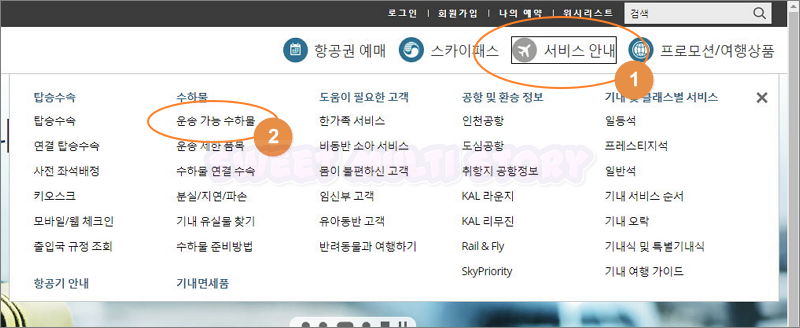 ▼ 대한항공 홈페이지에 접속했습니다. 서비스 안내 메뉴를 클릭합니다. 그다음 수하물 카테고리에 있는 "운송 가능 수하물"을 선택하면 기내용 캐리어에 대한 사이즈, 무게 등에 대한 내용을 찾아볼 수 있습니다.