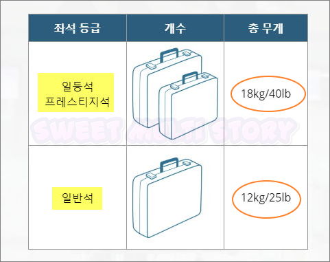 ▼ 휴대수하물 허용량은 이용하는 항공사에 따라 조금씩 다를 수 있습니다. 항공사에 따라 자체적으로 정해 놓은 규정이 있기 때문입니다. 대체적으로는 비슷한 수준으로 대한항공 기준을 알려드릴테니 참고하시길 바랍니다. 대한항공의 경우 일등석과 프레스티지석의 경우 허용되는 기내용 캐리어의 무게는 18kg/40lb 입니다. 일반석의 경우 12kg/25lb에 해당합니다.