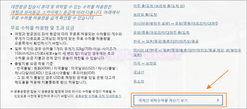 ▼ 대항항공을 탑승하는 경우 휴대 및 위탁할 수 있는 수하물(기내용 캐리어) 허용량은 여러 조건에 따라 달라진다고 합니다. 무료 이용을 할 수 있는 수하물 허용량은 사이즈와 무게를 기준으로 확인할 수 있습니다. 허용량 이상이라면 요금이 발생하게 되는데, 이에 대한 금액을 알아보려면 우측 하단에 있는 "국제선 위탁수하물 계산기 보기"를 클릭하면 됩니다.