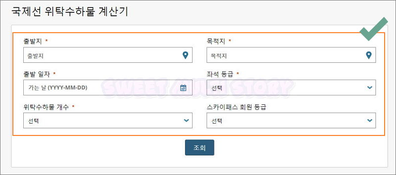 ▼ 국제선 위탁수하물 계산기를 사용하는 방법은 어렵지 않습니다. 출발지, 목적지, 출발 일자, 좌석 등급, 위탁수하물 개수, 스카이패스 회원 등급을 입력한 후 조회 버튼을 클릭하면 됩니다. 이런 식으로 기내용 캐리어 사이즈를 알아보고, 용량 초과시 발생하는 요금을 계산해 볼 수 있습니다.