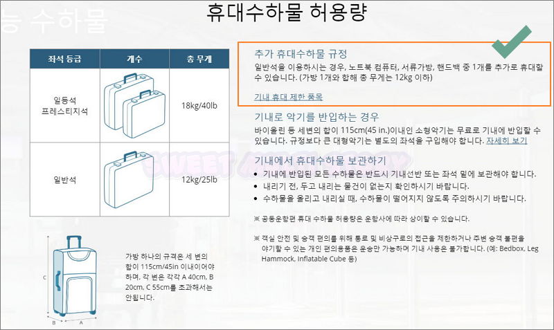 ▼ 휴대수하물 허용량에 대한 설명입니다. 일반석을 이용하는 경우 노트북 컴퓨터, 서류가방, 핸드백 중 1개를 추가로 휴대할 수 있다고 합니다. 이러한 부분을 알고 있으면 기내용 캐리어를 어떤 식으로 꾸릴지 고민할 때 도움이 됩니다.