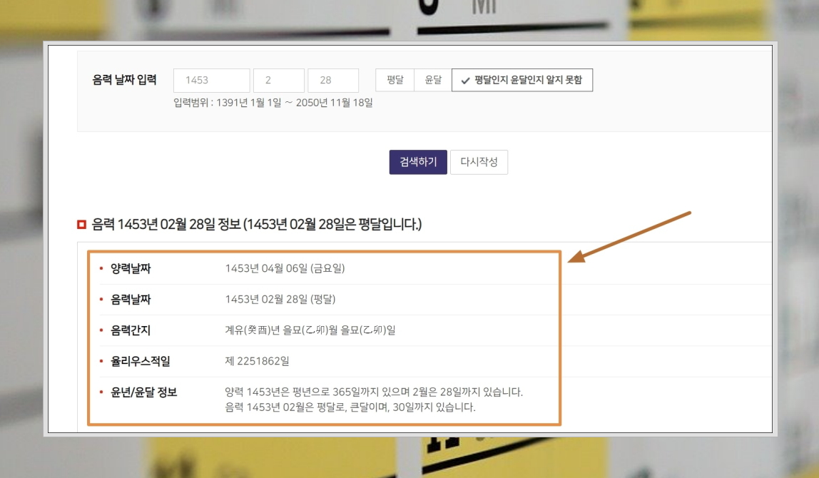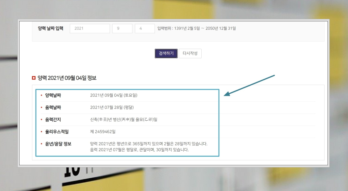 4. 날짜를 입력하고 "검색하기" 버튼을 누르면 바로 아래에 결과 확인이 가능합니다. 변환된 날짜는 물론이고, 율리우스적일, 윤년 및 윤달 정보까지 확인이 가능합니다.