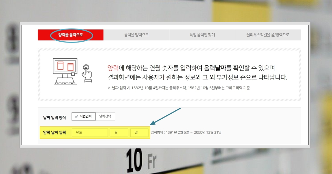 5. 이번에는 반대로 음력에서 양력으로 변환을 해보도록 하겠습니다. 이 때에도 동일하게 날짜를 입력하면 됩니다.