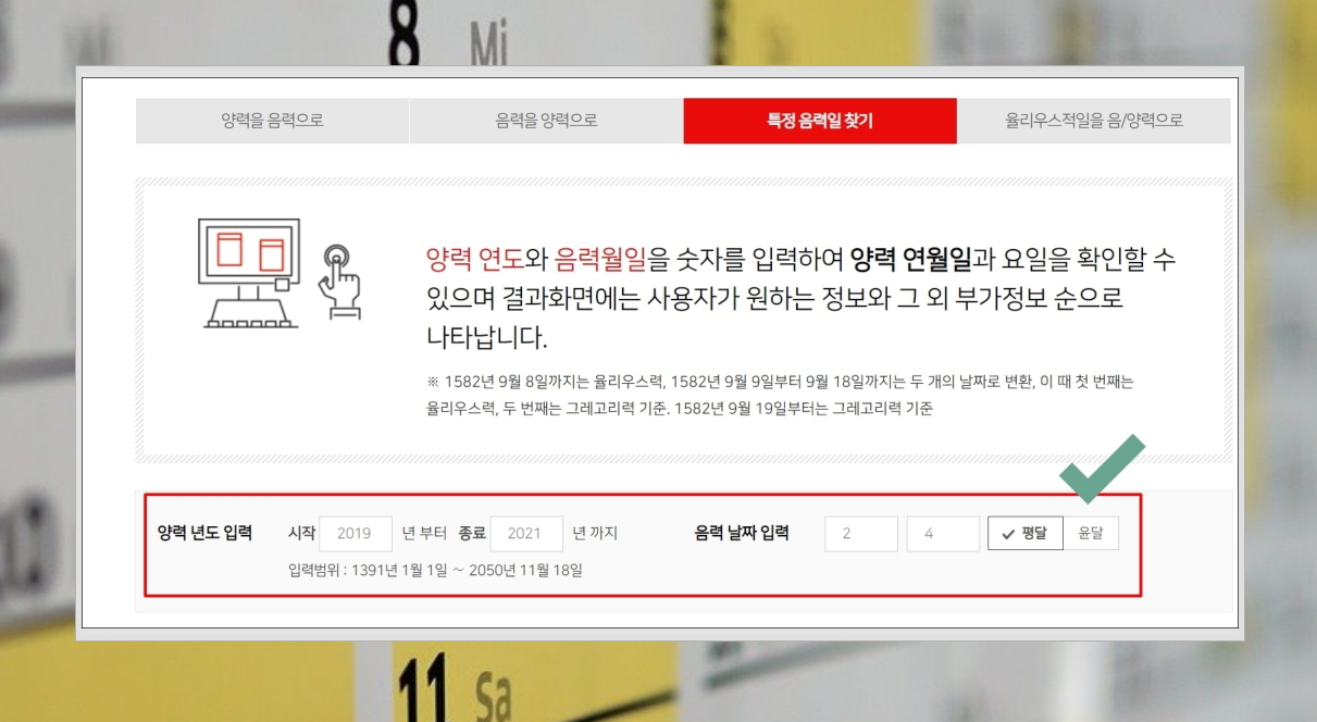 7. 연도와 월일을 숫자로 입력하면 양력 연월일과 요일을 확인할 수 있는데요. 특정 음력일 찾기 기능을 사용하면 됩니다.