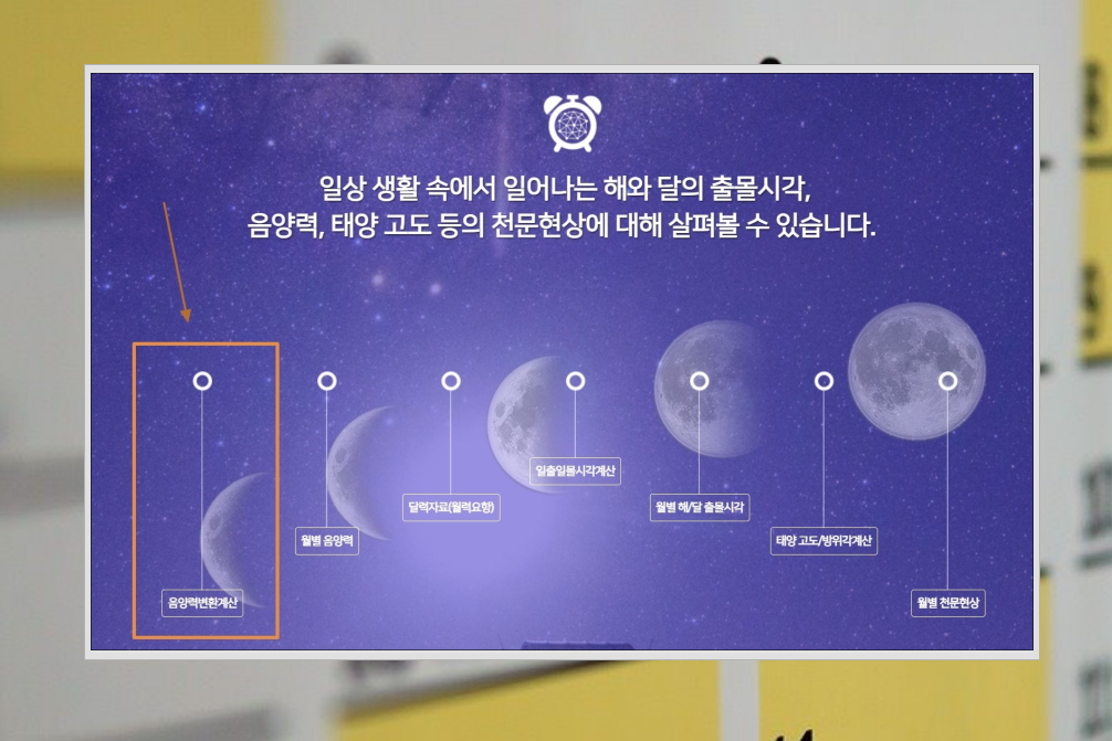 1. 우리가 이용할 변환기는 한국천문연구원에서 운영하는 사이트에서 만나볼 수 있습니다. 생활천문관 서비스인데요. 사이트에 접속해서 어떻게 이용하는지 알려드리겠습니다.