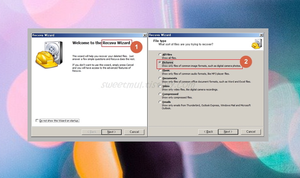 레큐바 마법사를 이용하면 스마트폰에 있는 사진을 간단하게 복구하실 수 있는데요. Next를 누르신 후에 ②와 같이 Picture(사진)을 클릭해주세요.