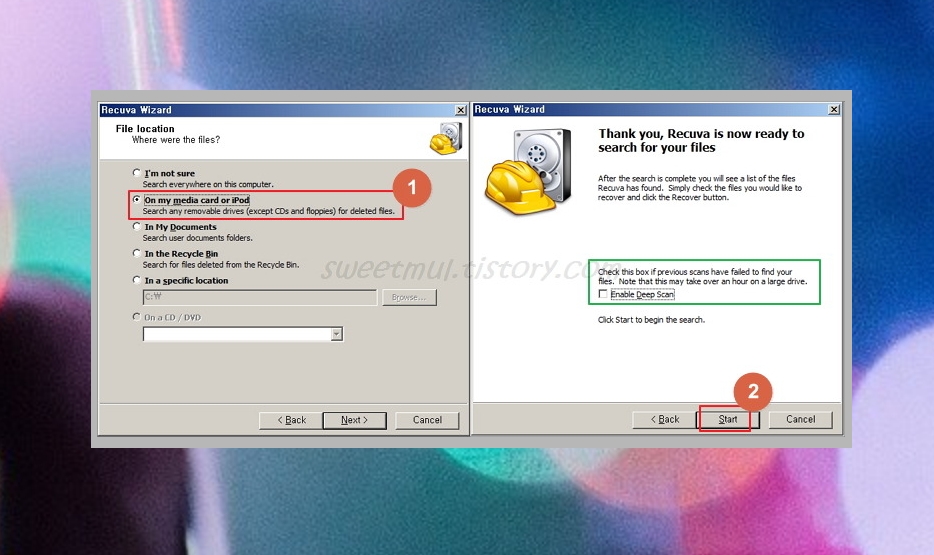 우리가 사용하는 사진들은 Media card에 들어 있답니다. 컴퓨터에 연결을 하거나 안 할수 있기 때문에 Removable drives라고도 불리기도 하고요. 이를 선택하고 스마트폰을 연결한 후 ②을 누르시면 되는데요. 스캔을 통해 사진 복구가 안되었다면, 녹색박스 부분을 체크한 후 다시하시면 됩니다.
