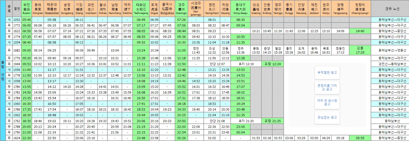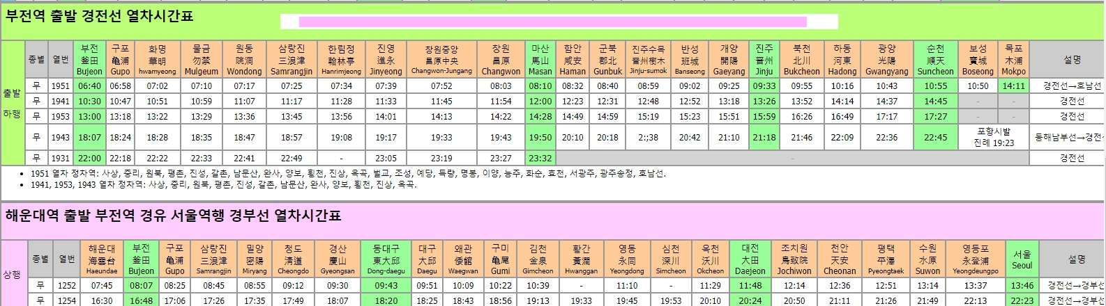 파일을 열어보면 시트 이름으로 열차노선이 나오는데요. 부전역을 지나는 경전선, 동해남부선, 중앙선, 영동선 외에도 다른 노선에서 운행하는 기차의 시간표를 확인할 수 있습니다. 부전역 외에도 사상역, 구포역, 화명역 등 다양한 곳에서 기차가 몇 시에 도착하는지 알고 싶을 때 이용해 보세요.