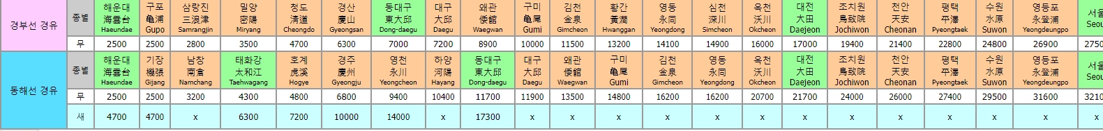 인구가 늘어나고 물가가 상승하면서 교통 상황도 달라지기 마련입니다. 당연히 교통 운임도 지속적으로 상승하고 있는데요. 부전역 기차시간표와 함께 요금표를 살펴보도록 하겠습니다. 현재 시점에서 다운 받은 것을 공유해 드릴테니 참고하시길 바랍니다. 시기에 따라 요금이 더 올를 수 있다는 점 알아주시길 바랍니다.