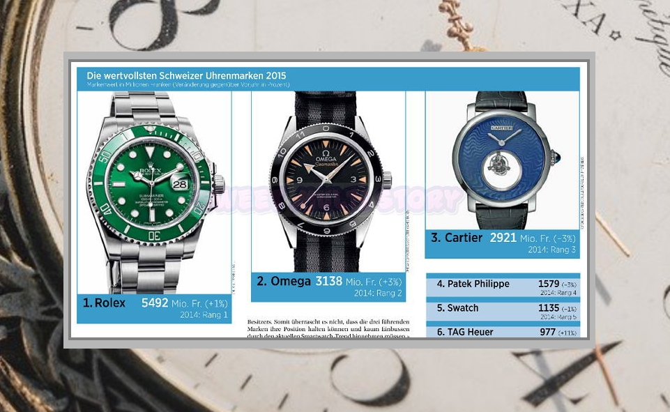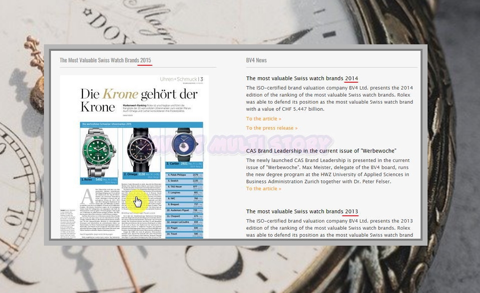 보시면 2013년, 2014년, 2015년의 브랜드 순위와 기사를 읽어볼 수 있는데요. 영어로 나와있기 때문에 읽기 수월합니다. 크롬을 사용하신다면 한국어 번역 서비스를 이용해보세요. 영어, 스위스어를 몰라도 숫자만 볼 줄 알면 남자 시계 순위를 보는데에 부족함은 없긴 합니다.