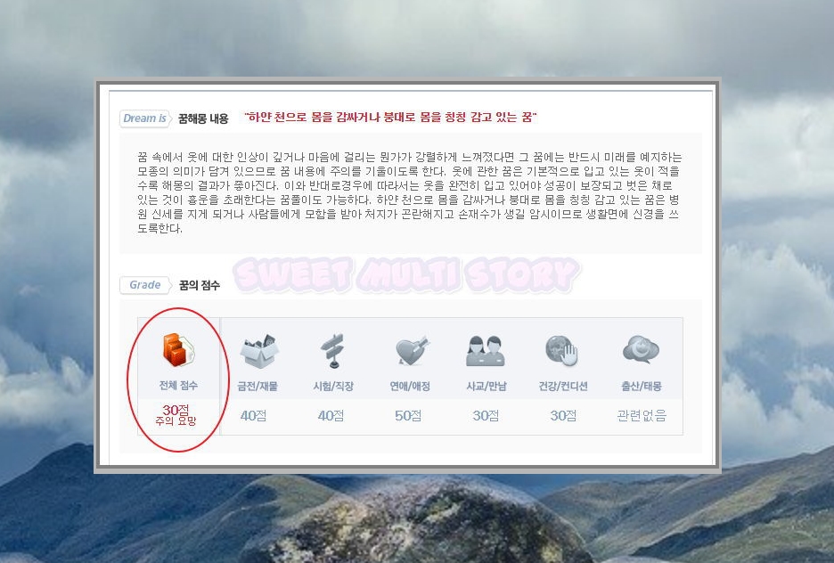 여기는 회원가입을 하지 않아도 바로 꿈풀이를 할 수 있는 곳인데요. 무료 보기 가능한 곳임에도 퀄리티가 매우 좋습니다. 여기서는 해당 꿈에 대한 점수를 알 수 있는데요. 결과 내용을 쉽게 이해하는 데에 많은 도움이 됩니다.