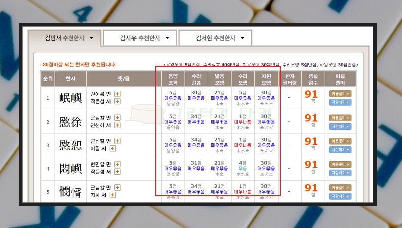 선택한 성명에 대하여 5개씩 좋은 한자를 추천받을 수 있는데요. 음양의 조화가 맞는지, 발음오행, 수리오행, 자원오행에 대한 평가도 볼 수 있습니다.