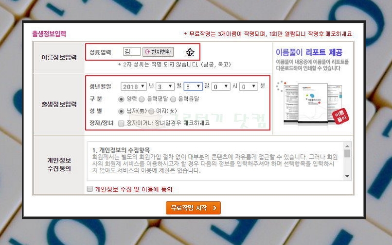 성명학에서는 출생정보를 기반으로 좋은 것인지의 여부를 파악할 수 있습니다. 간단한 정보를 입력해주세요.