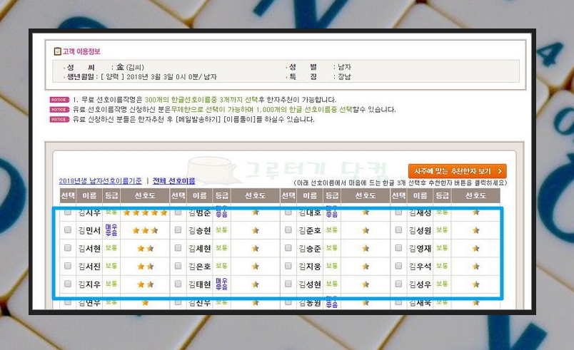 수많은 김씨남자 좋은 이름 모음이 나타났는데요. 여기에서 3개를 선택한 후 '사주에 맞는 추천한자 보기'를 클릭해보세요. 한자를 얻을 수 있습니다.