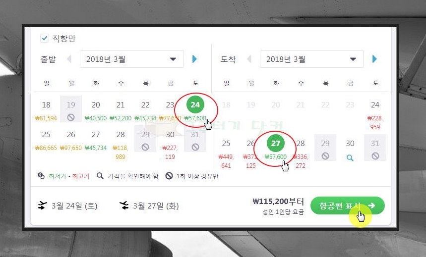 주의해야 할 부분은 '직항만'에 체크하는 것인데요. 이렇게 하지 않으면 매우 저렴하지만, 가까운 곳을 돌아서 가는 일이 발생할 수 있기 때문입니다. 또 한 가지는 비행기표의 가는날과 오는날을 '한 달 전체'로 지정하는 것인데요. 이렇게 해야 날짜별로 가격비교를 하여 최저가를 찾을 수 있습니다.