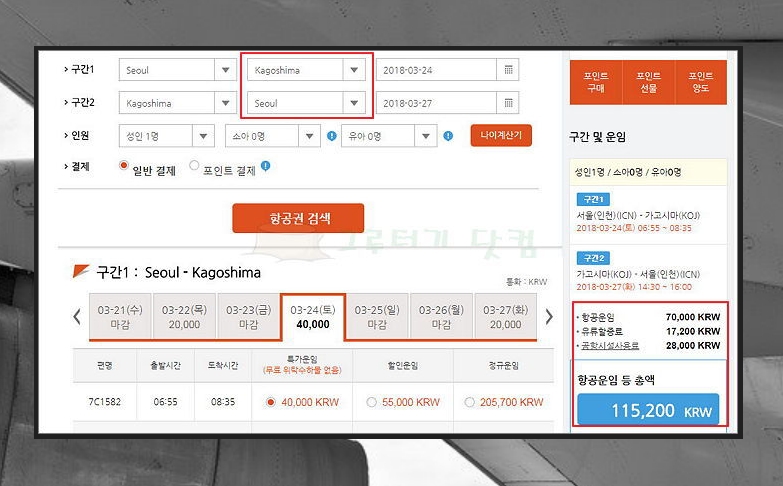 4) 현재 가장 저렴한 가고시마를 기준으로 일본 비행기표 가격비교를 해보겠습니다. 가고시마를 클릭하면 금액이 표기되어 있는 달력이 나타나는데요. 출발할 때와 돌아올 때의 최저가 항공권의 가격을 의미합니다. 여행 계획을 감안하여 최저가 금액이 적힌 날짜를 선택해 주세요. 제 경우에는 일본행 왕복 비행기표의 가격이 115,200원이 되었네요.
