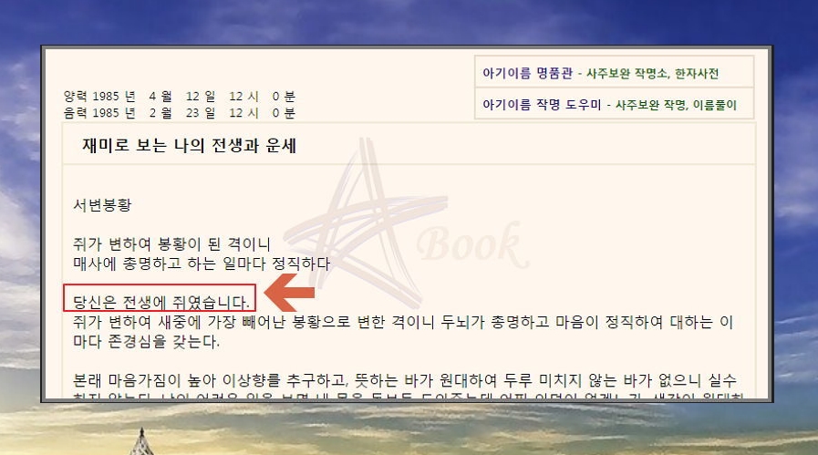 85년생 4월 12일로 테스트를 해본 결과 전생에 쥐였다고 나왔습니다. 쥐에서 사람이 되었으니 그만큼 두뇌가 총명하고 정직하다고 합니다. 현세에 대한 초년기, 중년기, 장년기, 노년기에 대한 내용도 나오는데요. 무료 운세를 함께 본다고 생각하시면 됩니다.
