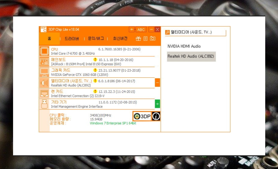 ▲ 메뉴에 있는 간편한 드라이버 검색툴이라고 적혀 있는 3DP Chip을 클릭합니다.